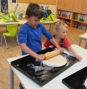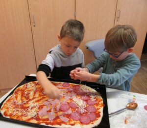 Die SVE-Kinder bereiteten währenddessen fleißig ihre Pizza vor. Sie rollten gemeinsam den Teig aus, bestrichen ihn mit Tomatensauce und wählten vielfältige Beläge.